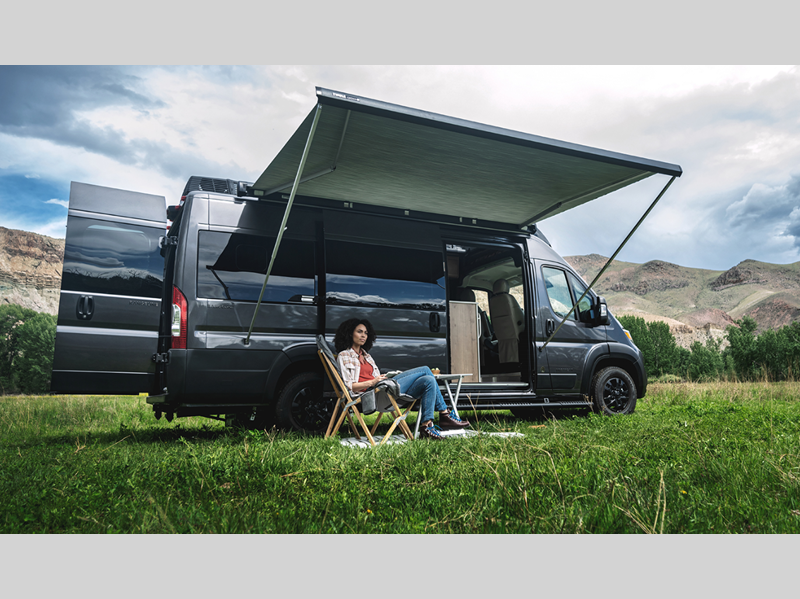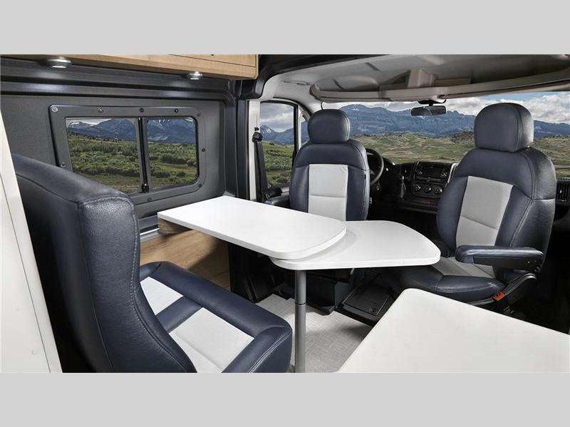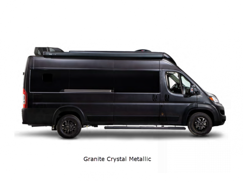 Sleeps 2 Length 20 ft 11 in Ext Width 8 ft 3 in Ext Height 9 ft 5 in Int Height 6 ft 2 in Interior Color Moonstone Grey, Admiral Navy Exterior Color Bright Silver Metallic, Granite Crystal Metallic GVWR 9350 lbs Dry Weight 7661 lbs Cargo Capacity 1689 lbs Fresh Water Capacity 28 gals Grey Water Capacity 19 gals Black Water Capacity 12 gals Generator 2.8 kW Gasoline with Remote Start Fuel Type Gasoline Engine 3.6L Pentastar V6 24V VVT Chassis RAM ProMaster 3500 Horsepower 276 hp Fuel Capacity 24 gals Wheelbase 159 in Torque 250 ft-lb Refrigerator Type 12 Volt w/ Marker Board Front Refrigerator Size 3.2 cu ft Cooktop Burners 1 Number of Awnings 1 Water Heater Type Gas Fired Hydronic AC BTU 13500 btu Awning Info 13' Manual Awning with Legs and Lighting Gross Combined Weight 12000 lbs Shower Type Wet/Bath Shower Electrical Service 30 amp