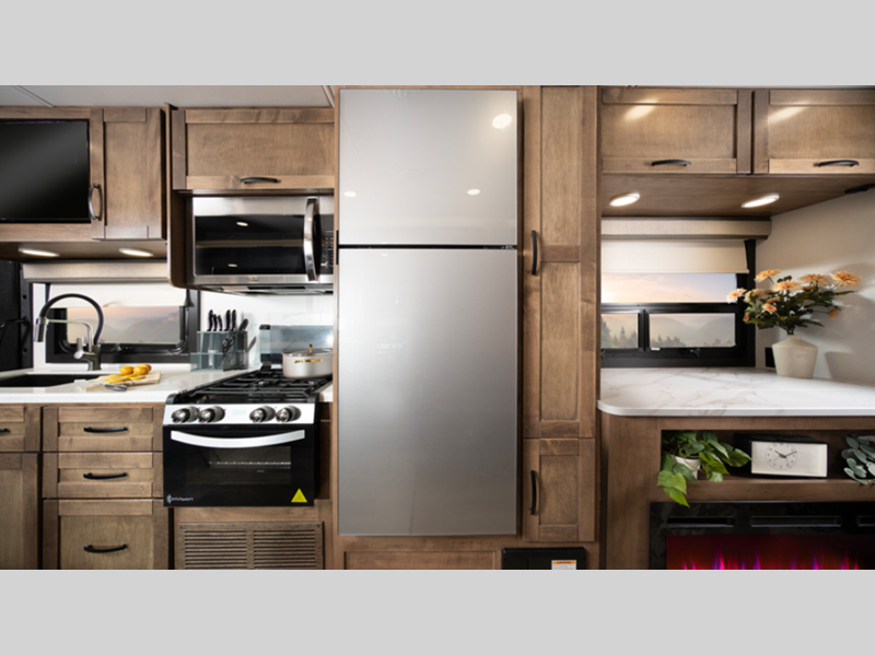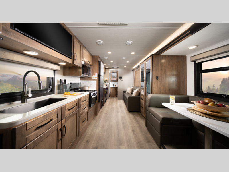 Sleeps 6 Slides 2 Length 33 ft 5 in Ext Width 8 ft 5 in Ext Height 12 ft 6 in Int Height 7 ft Interior Color Stillwater Exterior Color Partial Paint, Harvest Night, Night Shade, Summer Equinox, Winter Sky. Hitch Weight 12000 lbs GVWR 19500 lbs Fresh Water Capacity 42.5 gals Grey Water Capacity 31 gals Black Water Capacity 31 gals Tire Size 225/70R19.5 Furnace BTU 30000 btu Generator Onan 6,000 Fuel Type Diesel Engine 6.7L Power Stoke V8 Turbo Diesel Chassis Ford F550 4x4 Horsepower 330 hp Fuel Capacity 67 gals Wheelbase 227 in Number Of Bunks 1 Available Beds King Torque 950 ft-lb Refrigerator Type 12 Volt Refrigerator Size 10 cu ft Cooktop Burners 3 Shower Size 30" x 36" Number of Awnings 1 Axle Weight Front 7000 lbs Axle Weight Rear 14706 lbs LP Tank Capacity 56 lbs. Water Heater Capacity 10 gal Water Heater Type Gas/Electric AC BTU 15000 btu TV Info LR LED HD Smart TV, Ext LED HD Smart TV Awning Info 20' Electric with LED Lights Gross Combined Weight 31500 lbs Shower Type Standard Electrical Service 50 amp Similar Floorplans